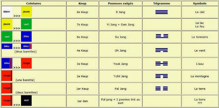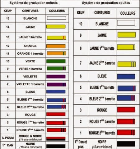 Dans les grades officiels, le pratiquant commence au rang de 10ème keup. Il se rapprochera alors pas à pas du 1er keup qui est associé à la dernière ceinture avant d'obtenir la tant convoitée ceinture noire